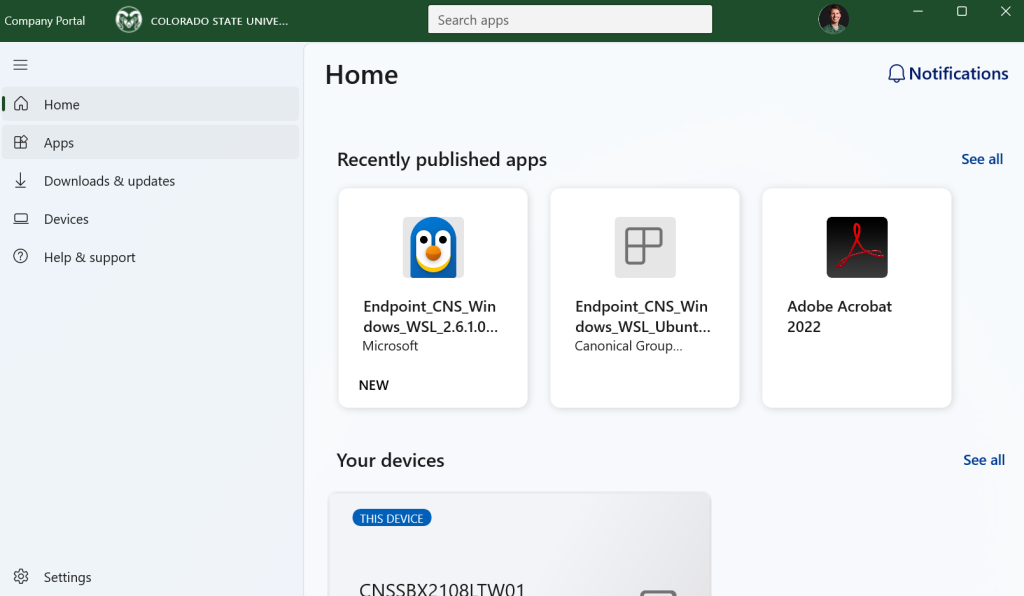 For devices that are managed in a co-managed state or Intune only state (as described here: https://cnsit.colostate.edu/kb/easing-into-intune/) the Company Portal is a user-facing app acting as a self-service store and management hub where users can securely access company resources such as applications as well as manage their enrolled devices in order to stay compliant with CSU’s cybersecurity and network policies.
